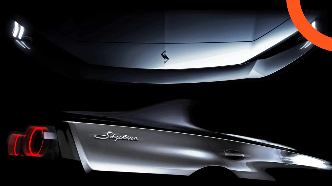 في الصور التشويقية، تظهر السيارة بمقدمة انسيابية مع شبك أمامي رفيع ومصابيح أمامية حادة تمنحها حضورًا هجوميًا. كما تبدو الأجنحة الخلفية بارزة مع نقش اسم Skyline عليها، في إشارة تعزز هوية السيارة وتاريخها.