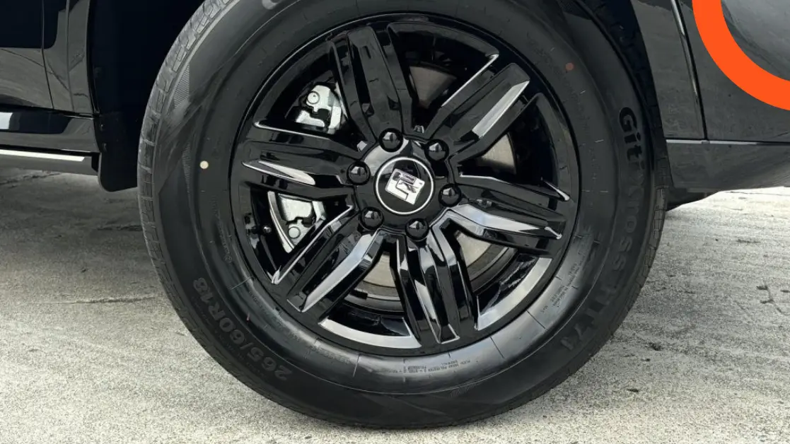 - لمسات سوداء شاملة تغطي الشبك الأمامي العريض، المرايا، الإطارات، وقضبان السقف.